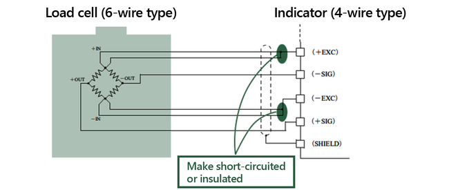 +S of the load cell should be short-circuited to +EXC and -S to -EXC, then connect only -EXC to the indicator. Otherwise, only +EXC and -EXC of the load cell should be connected to the indicator, and +S and -S should be wrapped by insulating tapes or the like.