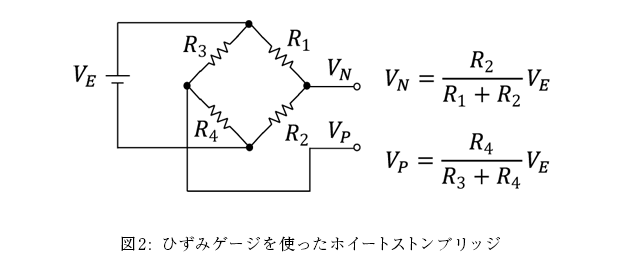 例えば、全てのゲージが同じ抵抗値を持っていると仮定し、ロードセルに力が加わったときにR1とR4に引張ひずみが、R2とR3には圧縮ひずみがかかるようにしておきます。引張ひずみがかかると、ひずみゲージの抵抗はわずかに大きくなり、一方、圧縮ひずみがかかると、ひずみゲージの抵抗はわずかに小さくなります。そのため、ロードセルに力が加わるとVPとVN電圧は互いに逆向きに変化し、その結果電圧差であるVP-VNが変化します。この変化量はもちろんロードセルにかかる力と印可電圧VEに比例します。