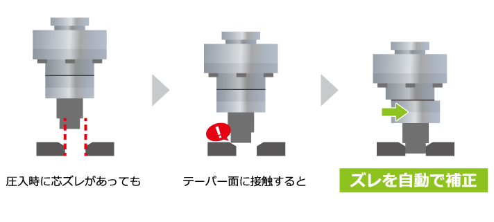 圧入時の位置のズレをテーパーにならって補正するだけではなく、ワークの圧入時の荷重の良否判定まで一度にできる